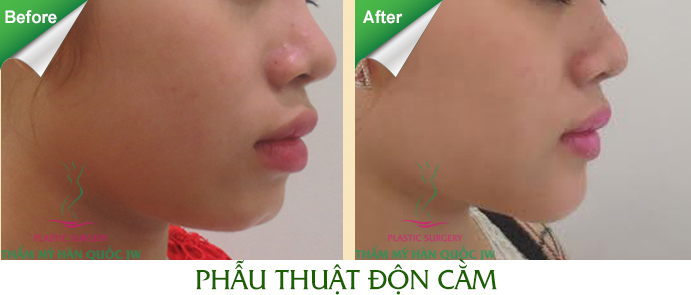 Trước khi thực hiện độn cằm, bác sĩ sẽ gây tê tại chỗ nên trong quá trình thực hiện không có cảm giác đau đớn hay bất kỳ khó chịu nào. Ngoài ra, bác sĩ chỉ mổ một đường nhỏ ở môi dưới nhằm tạo ra một khoang nhỏ để cho chất cấy ghép vào. Do đường mổ nằm hoàn toàn trong niêm mạc miệng nên sau khi liền không nhận biết được dấu vết của phẫu thuật.